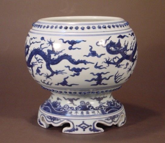 此类大器物在当时受烧造条件的束缚,外底部往往无釉,都是细沙底,没办法用青花料,或者其它彩料书写款识。再者大件器物不像小件碗、盘经常移动,翻转容易。底部常不示人,不如把款式写在容易被看到的口沿或器身上。
