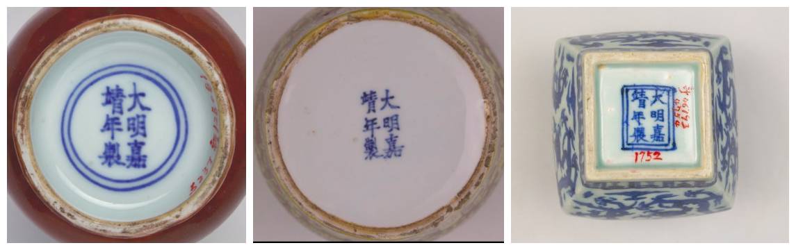 嘉靖时期大件器物,如大盘、大缸、大罐等落款则继承了永宣以来在器物外沿的习惯。从右往左“大明嘉靖年制”六字一字排开,外加双栏框。