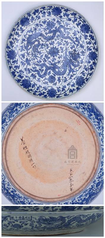 明嘉靖 青花龙穿缠枝莲纹大盘及其底部与款识