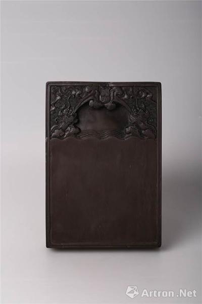 端石。长方式。石色青紫。质幼嫩。有青花。冰纹等石品。砚额雕二龙戏珠。砚底浅覆手。