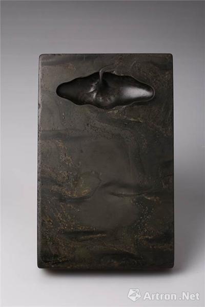 龙尾山歙石。长方形浅覆手。上雕一荷叶倒置为池。巧工奇思。砚面金星金晕与眉纹交相辉映。神采烂然。砚底金晕满布。有眉纹如波。似大漠瀚海。美哉斯石。