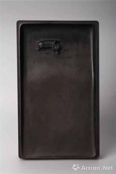 㠛村石。長方形淌池研。浅覆手,色青黑中泛微黄。池中雕卧牛作回首状。筋骨毕现。刻工极精。