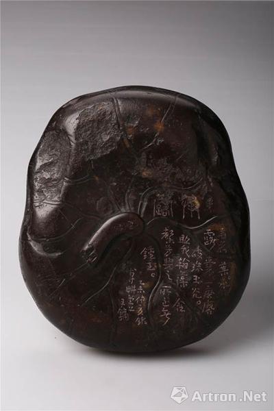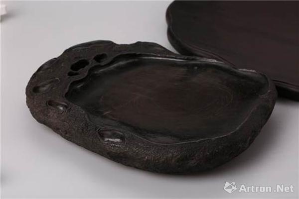 端石。随形砚。作天然卵石样。砚堂开阔。上以虫蛀洞为池。砚底留天然石皮。镌刻精妙。独得天趣。