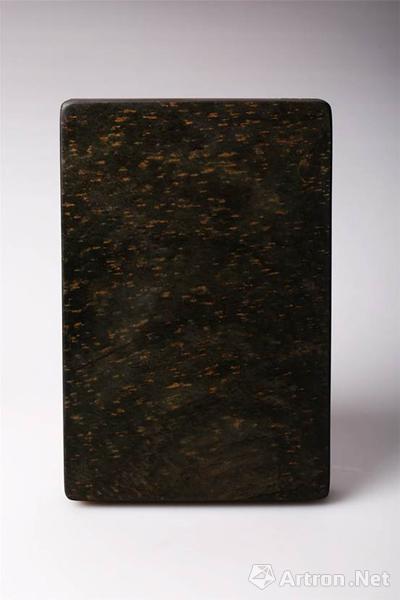 歙石板砚。色苍黑。质坚润。砚面砚底金星如雨。簇眉子纹如云。天然图画。石品上佳。
