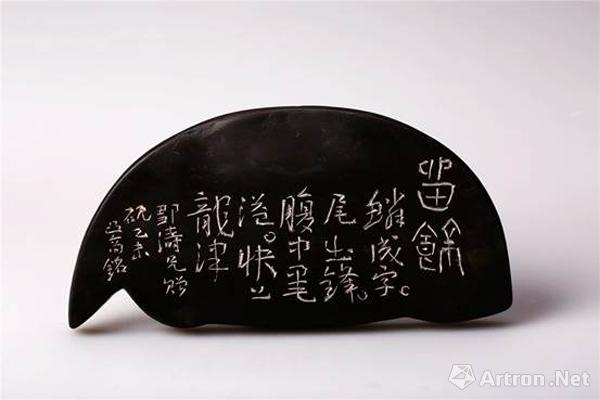 端石。石苍黑。质细润。整砚雕为鱼形。邹涛兄知余有《留余堂》斋号。因以此砚相贻。